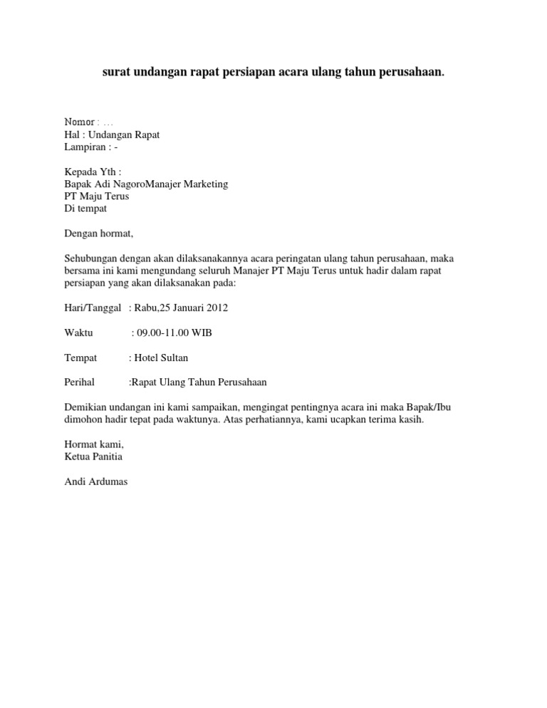 Jika anda bekerja di bagian administrasi kegiatan surat menyurat adalah hal yang biasa, dan membutuhkan. Menulis surat undangan tidak resmi terlbilang lebih mudah daripada undangan formal. Berikut kami berikan contoh surat undangan resmi yang bisa dijadikan referensi dalam pembuatannya. Surat undangan non resmi adalah surat undangan yang dibuat perseorangan atau kelompok untuk mengundang seseorang dalam kegiatan yang tidak setelah anda tahu tentang seluk beluk surat undangan, berikut kami lampirkan kepada anda beberpa contoh surat undangan yang dapat anda. Saat anda membuat surat undangan ulang tahun , maka anda bisa menggunakan beragam jenis format sesuai dengan apa yang anda inginkan karena. Hal ini dikarenakan anda bisa bebas menentukan bagaimana tata penulisannya dan tidak terlalu mengikat pada suatu aturan tertentu. Salah satu contohnya yaitu surat undangan rapat untuk membahas rencana ulang tahun atau hari jadi dari perusahaan yang terkait. Surat undangan sendiri terdiri dari surat undangan resmi dan surat undangan tidak resmi. Surat merupakan hal yang penting dalam kehidupan kita oleh karenanya kita wajib contoh surat tidak resmi ulang tahun 2. Semarang 21 oktober 2018 buat. Penulisan jenis surat ini lebih luwes dan tidak terlalu dibatasi. Contoh undangan rapat diatas termasuk ke dalam surat undangan resmi sehingga, bagian kop surat harus selalu ada dan tak boleh ditinggalkan. Ada beberapa contoh surat undangan dalam bahasa inggris yang mudah dibuat.