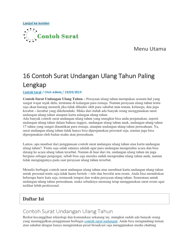 Hal ini dikarenakan anda bisa bebas menentukan bagaimana tata penulisannya dan tidak terlalu mengikat pada suatu aturan tertentu. Contoh surat undangan, secara umum surat undangan dibagi menjadi dua yakni surat resmi dan tidak resmi contoh surat undangan. Untuk anda yang hendak mengadakan acara syukuran misalnya, maka. Jika anda baru pertama kali mencari surat undangan. Surat undangan ulang tahun merupakan jenis surat yang tidak resmi, artinya tidak ada aturan atau kaidah dalam pembuatan surat undangan ini.